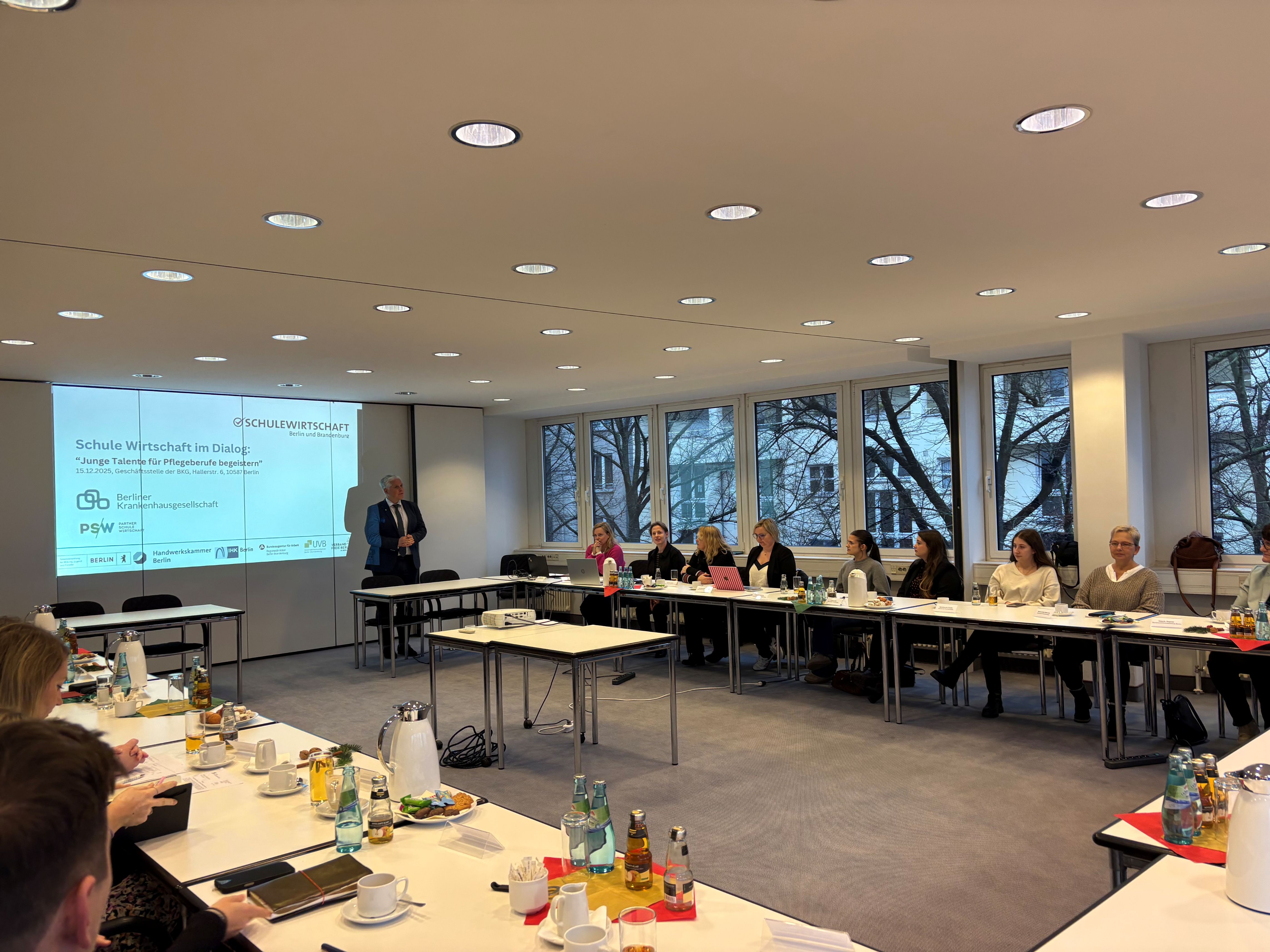 Ergänzend brachte die Veranstaltung „Schule Wirtschaft im Dialog“ am 5. Dezember schulberatende Lehrkräfte, Ausbildungsverantwortliche und Führungskräfte der Berliner Krankenhäuser zusammen. Thematisiert wurden Kompetenzen Jugendlicher, schulische Berufsorientierung, Ansprache und Integration in die Einrichtungen sowie Maßnahmen zur Abbruchreduktion. Erfahren Sie mehr in unserem Blog-Beitrag.